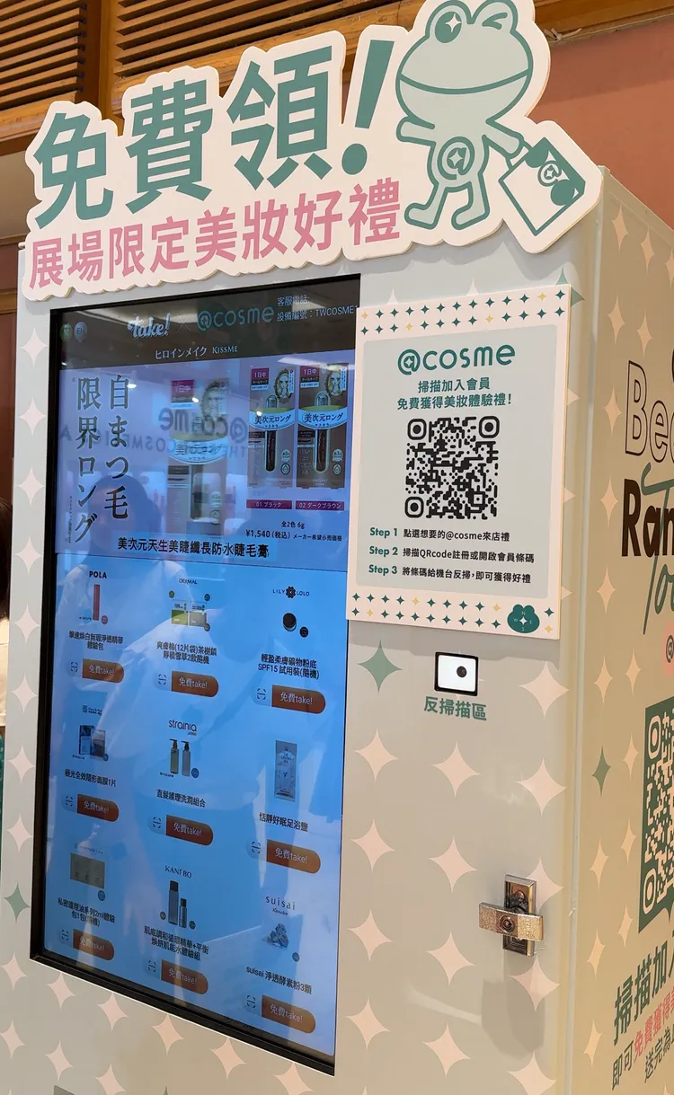 現場設置自動派樣機,讓消費者透過互動方式自由選擇領取專屬試用品,包含多種熱門美妝試用好禮 。