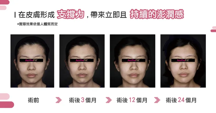 隨著膠原逐漸增生,肌膚恢復彈性與厚度,呈現自然澎潤與緊緻。變化不是突兀的「換一張臉」,而是漸進養成健康膚質,維持時間可達 18~24 個月,減少頻繁施打的困擾。