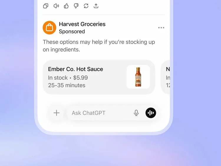 目前這波廣告僅在美國進行測試,且只會在「對話內容有相關贊助商品或服務」時出現。實際呈現方式為:主要回答內容置於上方,下方則以清楚分隔線標示「Sponsored」的贊助結果。OpenAI示範中,像是詢問「正宗墨西哥料理靈感」,下方就會出現與食材或外送平台相關的廣告;搜尋旅遊資訊時,則可能看到住宿或在地服務的推廣,甚至能直接「和廣告主聊天」詢問細節。