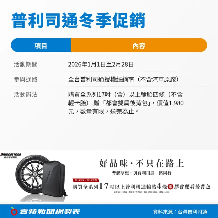 為保障消費者的旅程安全,普利司通特別推出「好品味.不只在路上」促銷活動,以多樣化的產品線協助車主應對春節漫長的返鄉旅程。期間內凡購買四條17吋(含)以上輪胎(輕卡胎除外),便可獲得都會雙肩後背包。