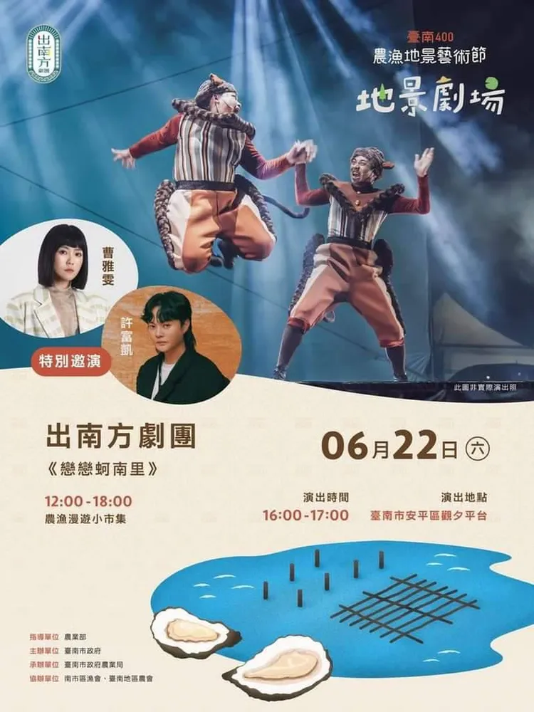 農業局長李建裕指出,這次特別結合演唱會及舞台劇,全新創作歌中劇,表演將以「蚵業」為主軸,透過金曲歌王許富凱及金曲歌后曹雅雯演唱為引導,搭配著出南方劇團的演出,展現台南蚵業的獨特性。歡迎民眾坐在野餐墊上,吹著海風、看夕陽、遠眺海面蚵棚,以最輕鬆的心情觀看,沉浸在藝術結合地景的全方位體驗。