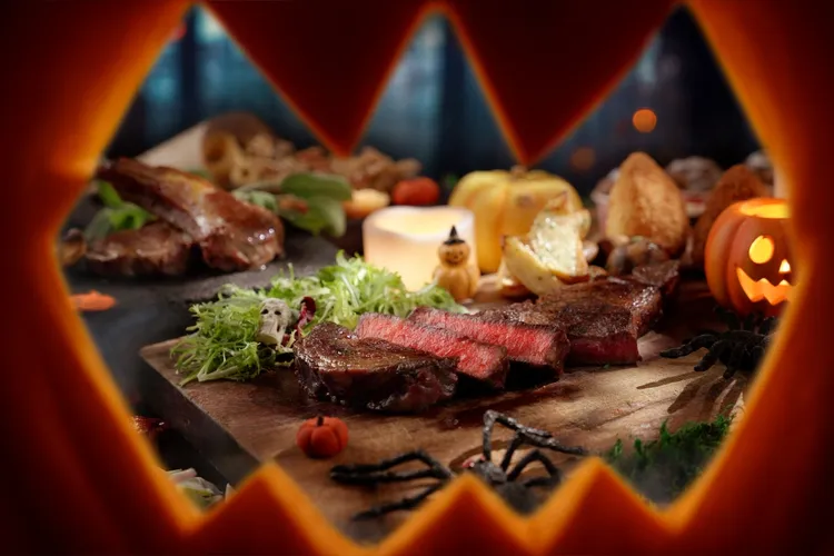 「Ciao西西里牛排餐酒館」於10/27起至11/2推出晚間限定的「女巫市集饗宴」,餐廳空間以藍、黃交錯的燈影營造古堡般的神祕氛圍,用餐期間還有機會巧遇女巫現身。萬聖節饗宴以義大利市集概念結合半自助形式呈現,可單點沙拉吧980元,亦提供三款主餐選擇,餐價1480元起,須外加一成服務費。從沙拉吧、前菜、主菜到甜點皆融入節慶巧思。前菜區供應香料南瓜湯、義式炸飯糰、炸海鮮與西西里風味小食;甜點區則以十多款萬聖節造型甜品吸引目光,讓視覺與味覺一次滿足。