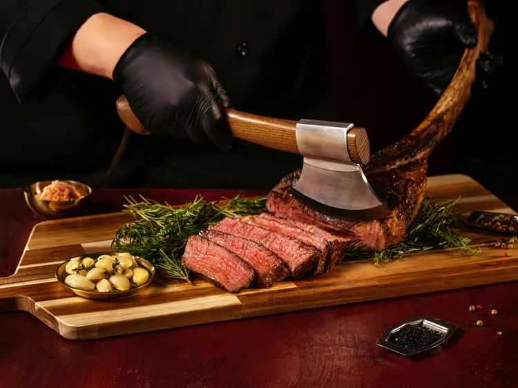 打造感官頂級饗宴,百年澳洲牧場巧克力和牛以冷泉雙焰炙燒呈現桌邊華麗酒焰秀,亮點為60盎司厚切、長達40公分的澳洲Mayura Station全血巧克力和牛戰斧,牧場位於南澳石灰岩海岸,以可可豆與穀物飼養達36個月,肉質細膩如絲,油花滑順香甜。