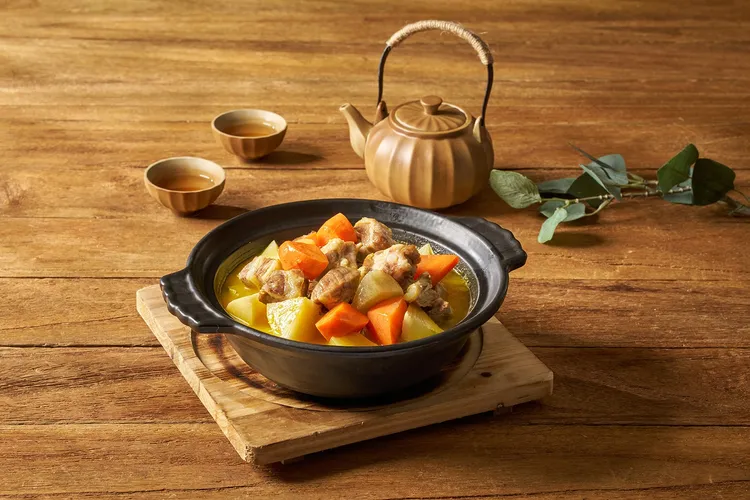 雙人套餐的核心亮點「黃金老火煲湯」,承襲經典粵式老火湯的靈魂。湯底嚴選整隻土雞、豬後腿肉,再加入甜度較優的青蘿蔔及紅蘿蔔,經過半天燉煮,透過精準掌控火侯,將食材精華及甜味融入至湯底之中,使湯頭色澤呈現飽滿金黃。隨後將湯底材料全數過濾,重新加入青蘿蔔、紅蘿蔔、豬腩排,再以至少 4 小時的時間慢火燉煮。這道費時近 20 小時、分階段淬鍊而成的金黃湯品,湯色清澈且口味深厚,豬腩排入口即化,在口中緩緩釋放溫潤而紮實的甘鮮滋味。