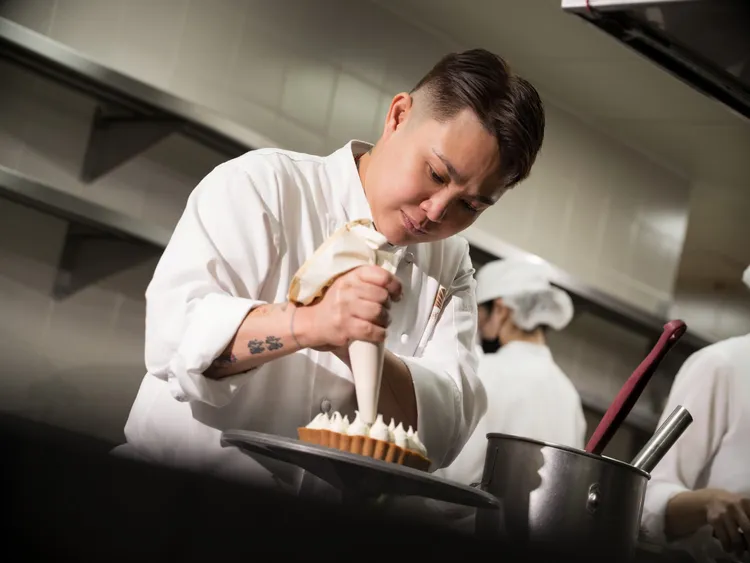 對胡主廚而言,甜點是一場關於感官與記憶的對話。她偏好以當季食材為創作核心,透過酥脆與柔滑、溫熱與冰涼、甜味與微苦等對比層次,營造出如樂章般的味覺起伏,使甜點不僅止於美味,更成為令人難忘的感官體驗。