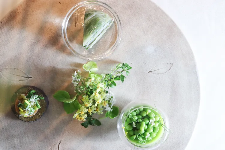 高山英紀將餐盤視為大地縮影,從仍帶寒意的純白出發,逐步鋪陳象徵生命力的嫩芽與青綠色彩。整體菜單以鮮蔬、貝類與蘆筍等當季食材為主軸,透過「生嫩、脆響、微苦、至甜、洋鮮」五大風味語彙,勾勒春季專屬的味覺地景。