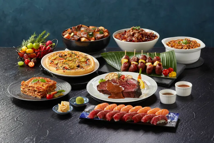 甜點區同樣誠意滿滿,琳瑯豐富、香甜誘人。「焦糖巧克力蛋糕」鬆軟蛋糕體夾入焦糖餡,點綴巧克力鮮奶油,微苦帶甜,香濃療癒。「巧克力菠蘿泡芙」外層酥脆、內餡細滑,可可香味縈繞,醇美回甘。金黃耀眼的芒果系列甜點更是讓人垂涎,無論是滑嫩可口的「芒果奶酪」,或是香滑卡士達餡佐搭新鮮芒果丁的「芒果塔」,道道都是酸甜清爽,果香馥郁。其它像是藍莓派、檸檬派、德式巧克力慕斯蛋糕等也將輪番登場,為滿載肉香的和牛饗宴畫下輕盈甜美的句點。