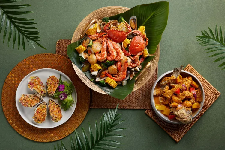 南洋鮮味季共有六道全新料理,其中「叻沙海鮮盤(NT$999)」匯集藍蟹、草蝦與干貝等豐盛海味,份量澎湃、氣勢十足!取香茅、南薑、乾辣椒、蒜頭、干蔥、芫荽籽打成香料泥,與蝦米碎、烤過磨粉的峇拉煎翻炒至香氣四溢,再調和椰漿及少許高湯熬出濃醇叻沙醬,以此拌炒海鮮及時蔬,豐美食材吸附辛香馥郁的醬汁精華,豪邁抓食、吮指品嘗最過癮!風味獨具的「火炬薑焗烤鮮蠔(NT$799)」,在濃郁的白醬中,特別添入兼有柑橘清香及些許薑辣氣息的火炬薑花蕾,鋪覆於碩大鮮嫩的生蠔上,高溫焗烤催化香氣,更顯蠔肉鮮甜。