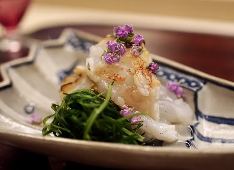 主廚山崎志朗並非傳統守成型職人,而是以紮實和食底蘊為基礎,吸納跨文化技法重構味覺體驗。早年於もりかわ長期修業,之後在Chiune與Aca等場域汲取靈感,逐步發展出強調「層次堆疊」與「風味輪廓清晰化」的個人語彙。他的料理不是炫技,而是去除多餘修飾後,讓味道本身說話,同時透過酒體結構去放大料理表現。