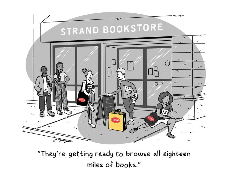 伴隨著限量推特包的推出,BV更有一系列特別委託《The New Yorker》(紐約客)雜誌繪製一系列漫畫插圖來紀念這一時刻,5幅饒富趣味的漫畫,恰恰反映Strand書店以及其logo托特包對文化界的影響力。