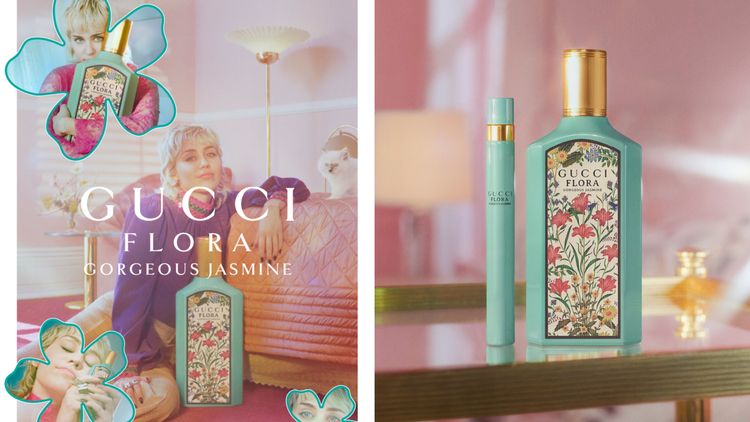 GUCCI幻夢茉莉花女性淡香精,以大花茉莉為香氛主軸,搭配檀香木、安息香基調,以及柑橘、木蘭花等香氣,呈現滿滿的歡樂氣息,讓麥莉在最新形象廣告中,愛到把巨型香氛瓶「抱緊緊」。