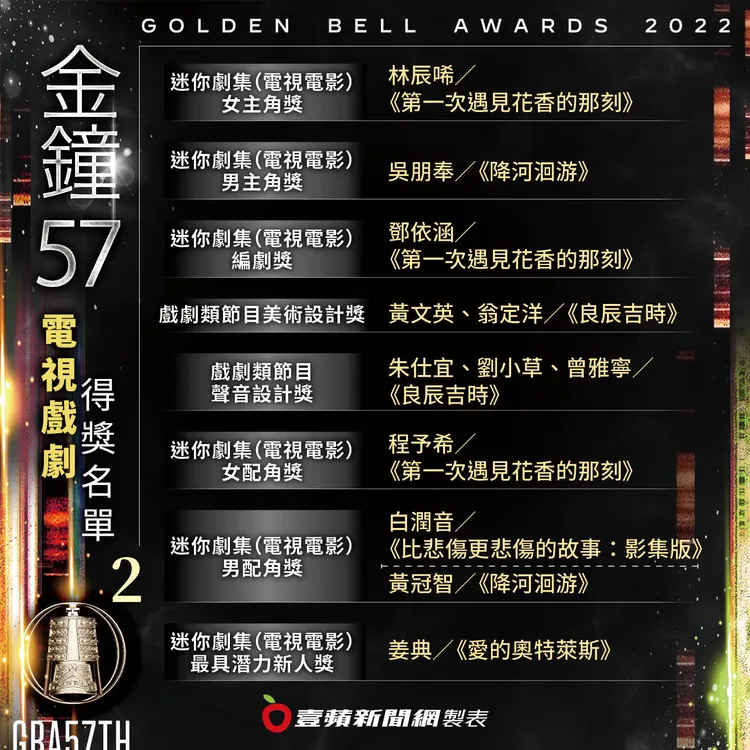 迷你劇集/電視電影女主角獎由《第一次遇見花香的那刻》的林辰唏獲得,她上台後哽咽感謝已先得獎的程予希(樂樂),也謝謝導演鄧依涵的相信和包容,並且感謝世界各地粉絲讓花開遍地,當然也不忘感謝導演男友林立書以及兒子Bio。