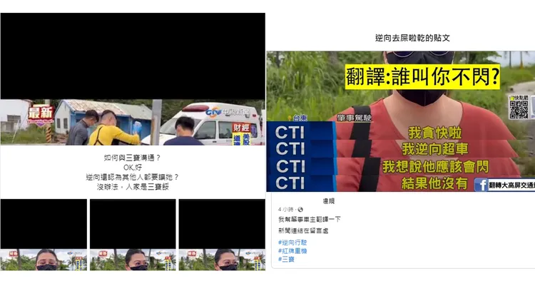 近來發生一起車禍,女駕駛逆向超車,卻撞上重機,導致對方骨折。女駕駛也接受電視台採訪,事後她訪問被截圖瘋傳,三句話依序為「我逆向超車」、「我以為她應該會閃」、「結果他沒有」。