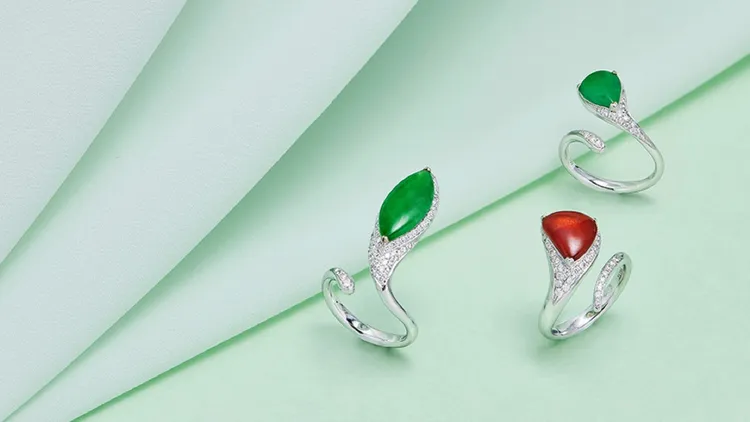 另1款水滴形切割綠翡蛇形指間戒,鑲嵌較為圓潤的水滴形切割綠翡,呈現溫婉氣息,戒指尾端則以回勾的蛇尾線條設計,展現「小龍」的嬌俏形貌;還有1款紅翡蛇形指間戒,水滴形切割紅翡鑲嵌於立起的貴金屬戒環上,其紅翡豔中帶神祕的色澤,引出如靈蛇昂首凝視的姿態,別顯氣質。