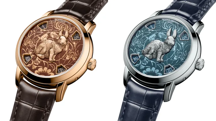 江詩丹頓藝術大師兔年腕錶分別推出鉑金與18K 5N粉紅金錶殼款式,錶徑40mm,面盤上呈現完整且精細的生肖形貌,並搭載2460 G4自動上鍊機芯,將小時、分鐘、日期與星期窗配置於面盤外圈。金質面盤以浮雕技藝與半嵌式手法,將傳統花卉圖紋以高低層次呈現其上,凸顯立體感,並以大明火琺瑯上色面盤在800至900度的窯中反覆燒製,而得以創造純淨且深邃的色澤。