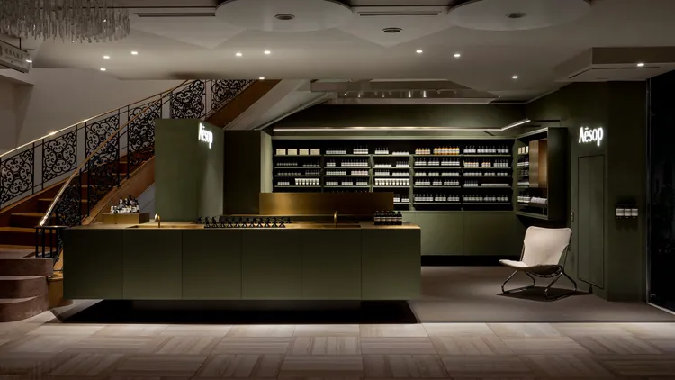 Aesop全新高雄漢神百貨店以旗津島狹長黑沙灘為設計靈感,將回收自南台灣人造儲水系統的淤泥,透過獨特改質技術,轉換為防水添加劑,用以保護牆面。店內選擇秋香綠為主色調,打造出如旗津島上的自然景象,水槽則選用有著斑駁樣貌的舊黃銅製成,代表品牌接納各材質隨時間變化的自然之美。