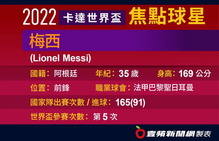 看到如此顯赫的豐功偉業,沒有球迷會懷疑阿根廷梅西(Lionel Messi)早已進入史上最偉大足球員行列,只是他的生涯若還有遺憾,那就是還沒有幫助阿根廷拿下世界盃冠軍,最接近的一次是2014年,最後在決賽與德國拼到延長賽以0比1飲恨。梅西今年已35歲,第5次,也可能是最後一次進軍世界盃,球迷當然希望他能圓夢,不要再唱《阿根廷別為我哭泣》。