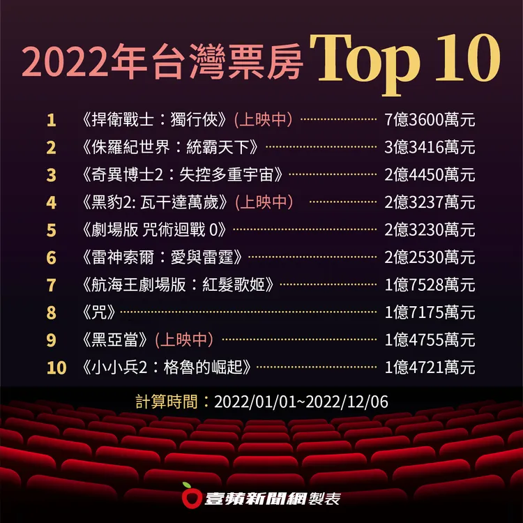 往年超級英雄電影所向披靡,今年3部漫威電影宇宙系列作《奇異博士2:失控多重宇宙》、《雷神索爾:愛與雷霆》與《黑豹2:瓦干達萬歲》的台灣票房都破2億元,可看出基本盤就是2億起跳,但離去年上映的《蜘蛛人:無家日》賣出近4.4億票房有一段距離;DC影業今年推出勞勃帕汀森主演的《蝙蝠俠》與巨石強森的《黑亞當》,這2位DC超級英雄電影中前者是重啟電影、後者是初登場的起源電影,還有「超人」亨利卡維爾回歸當祕密武器,《黑亞當》以1.4億排名台灣年度第9名。