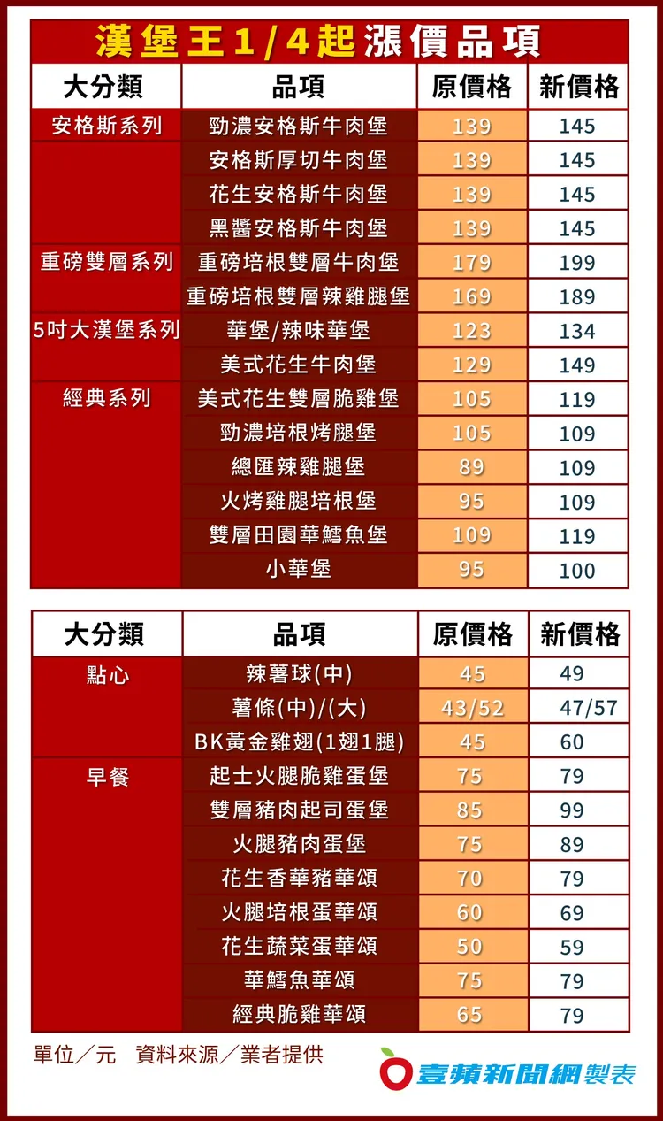 這次價格調整重點為部分漢堡產品單點調升4至20元,包括華堡調升11元、小華堡調升5元、勁濃培根烤腿堡調升4元、雙層田園華鱈魚堡調升10元、重磅雙層牛肉堡調升20元等。價格維持不變包括勁濃起士薯、洋蔥圈、巧克力聖代、草莓聖代、冰淇淋、蘑菇湯與濃起士火腿蛋堡等商品。