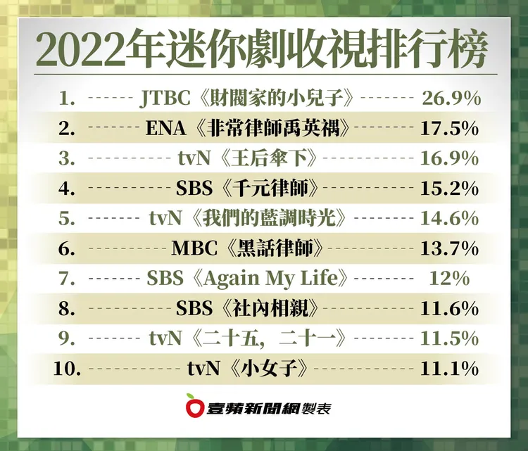 新興有線頻道ENA夯劇《非常律師禹英禑》是今年大黑馬,朴恩斌飾演踏入社會的天才自閉症律師,與外界碰撞成長,溫暖劇情發酵,讓收視從開播的0.9%,一路飆升到完結篇的17.5%,竄升迷你劇年度收視亞軍。朴恩斌因該劇暴紅,舉行出道26年首次見面會,從首爾起跑,還巡迴到泰國、新加坡、日本、菲律賓等地,足見她的高人氣。