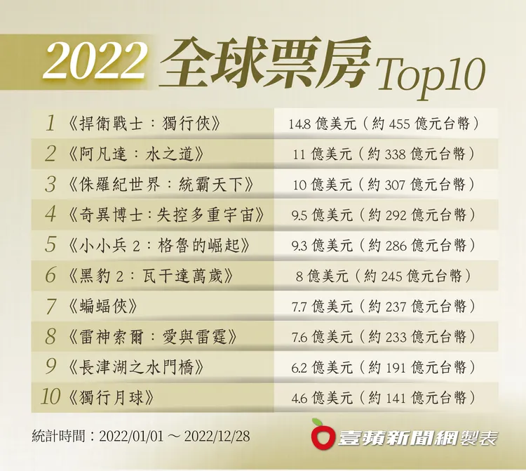 2022年的票房黑馬無疑是馬來西亞女星楊紫瓊主演的《媽的多重宇宙》,該片打破了藝術電影與主流電影的界線,全球賣座達1億美元(約30.7億元台幣)佳績。不僅票房亮眼,在發行商A24電影公司努力造勢下,60歲的楊紫瓊在影壇打拼多年,極可能以該片在奧斯卡封后。演她老公的關繼威、潔美李寇蒂斯表現也很出色。