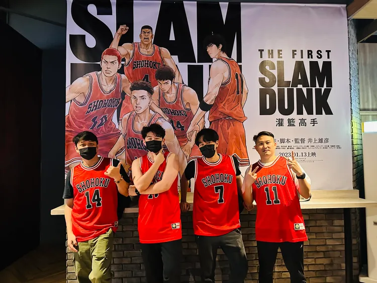 有網友在臉書「爆廢公社二館」發文貼出他與兄弟檔一同朝聖看《灌籃高手》的照片,只見4人都特地穿上劇中湘北高中的紅色球衣,在電影院的海報前合影留念,他說,這是屬於中年男子的浪漫,我們沒有哭,那是男子漢的感動,還標記#左手只是輔助、#我以為很多人會中二魂穿球衣、#真的「喝跨」(諧音台語的「好看」)。