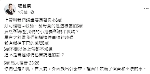 張維尼下午臉書轉分享阿Ben臉書貼文,聲援阿Ben,再嗆宋逸民夫妻「上帝叫我們講話要憑著良心,好可惜喔⋯牧師、師母真的是這樣當的,居然希望我們的小組長們串供嗎?」