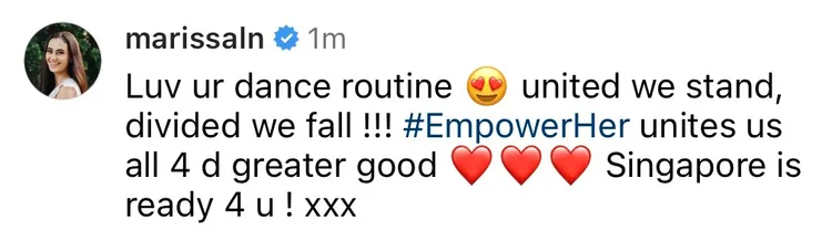 擁有130萬IG粉絲,居住在新加坡的印尼女演員Marissa L Nasution,也力挺Tia並在她IG影片下留言:「我們都應該將人們聚集在一起而不是分化他們,在#EmpowerHer下團結起來爭取更大的利益。」並表示她很期待Tia前往新加坡,到底新加坡是否有可能是Tia #EmpowerHer巡迴演出的第二站?