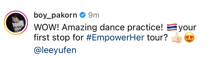 影片發佈後,擁有970萬IG粉絲的泰國人氣男星Boy Pakorn(Pakorn Chatborirak)也在她IG留言稱讚Tia的舞蹈,並邀請她到泰國作為巡迴演出的第一站。Tia的舞蹈練習是否意味著她即將展開 #EmpowerHer的巡迴演出?