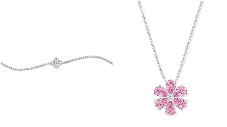 Diamond Loop系列鑽石手鍊中央鑲嵌4顆水滴形切割鑽石,搭配81顆圓形明亮式切割鑽石,共重約4.41克拉,底座為鉑金;勿忘我Forget-Me-Not系列粉紅剛玉和鑽石墜鍊鑲嵌12顆水滴形切割粉紅剛玉(重約2.29克拉)、2顆圓形明亮是切割鑽石(重約0.07克拉),底座為鉑金。