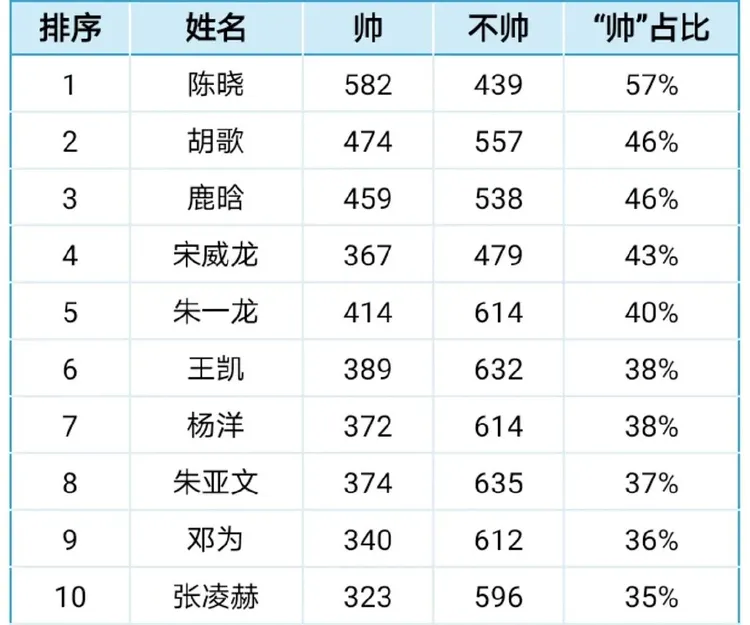 胡歌與鹿晗一個是40熟男的斯文帥,一個是韓團偶像出身的俊美帥,各有支持網友,2人差距極小,各自有約46%網友覺得他帥,分居第2、3名。而4至10名分別是宋威龍、朱一龍、王凱、楊洋、朱亞文、鄧為、張凌赫。
