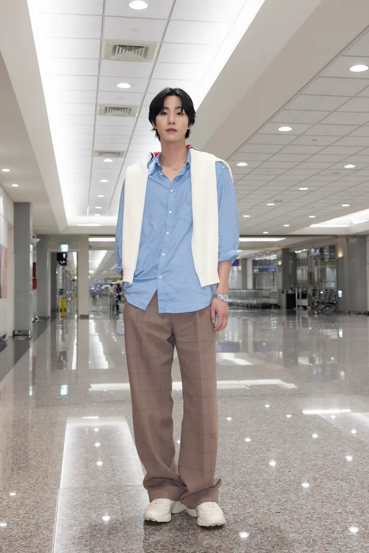 安孝燮上個月才來台灣舉辦首場粉絲見面會,今次再受GUCCI之邀炫風訪台,今他搭機抵台,身著GUCCI淺藍色襯衫,微開的領口秀出Gucci Link to love系列項鍊,搭配棕色大格紋長褲與Chuncky B休閒鞋,並將開襟針織毛衣輕鬆披上肩,展現率性的機場時尚。