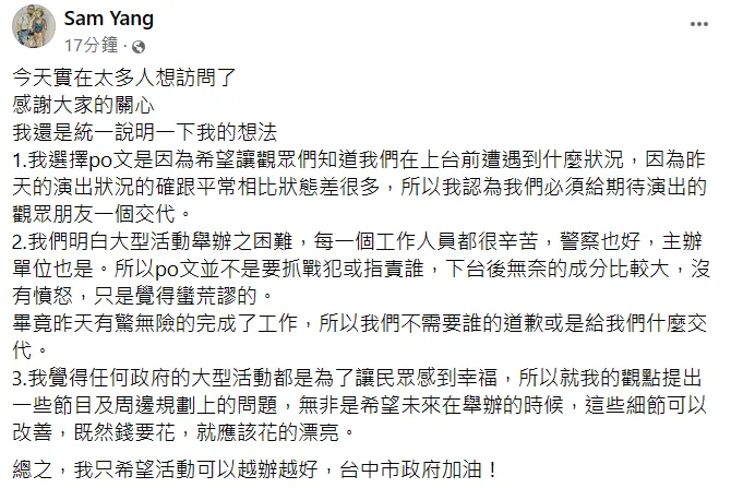 楊大正強調,明白大型活動舉辦之困難,每一個工作人員都很辛苦,警察也好,主辦單位也是。「po文並不是要抓戰犯或指責誰,下台後無奈的成分比較大,沒有憤怒,只是覺得蠻荒謬的。」「畢竟昨天有驚無險的完成了工作,所以我們不需要誰的道歉或是給我們什麼交代。」