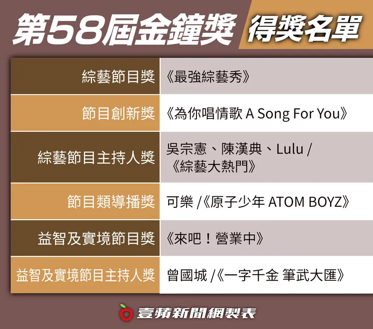 Lulu 則說這節目10年了,她直接以「家人」稱呼主持搭檔吳宗憲和陳漢典,能拿到這個獎,在充滿愛的工作環境,是一趟神奇的旅程,台下她的爸媽也舉牌尖叫慶祝。