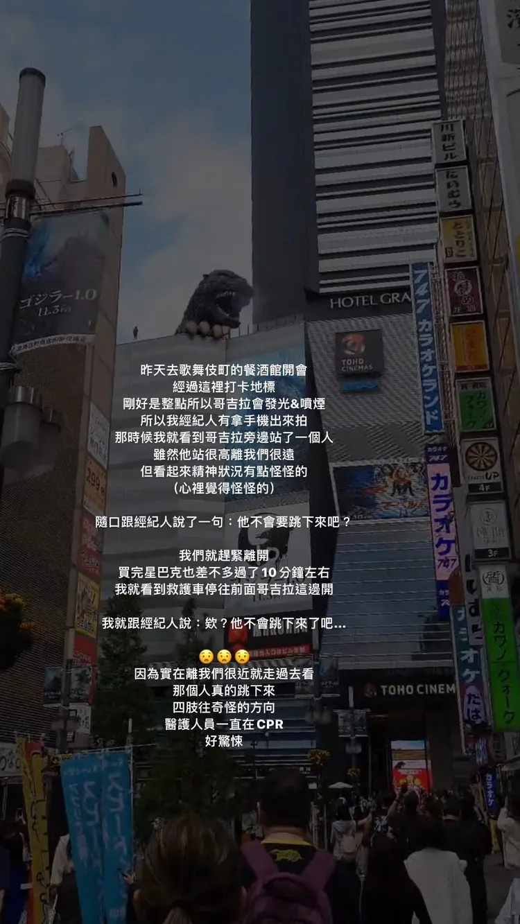 林襄稍早在IG限動發文表示,昨天她去歌舞伎町的餐酒館開會,經過這裡打卡地標「哥吉拉飯店」剛好是整點,所以哥吉拉會發光與噴煙,經紀人有拿手機出來拍攝,那時她就看到哥拉旁邊站了一個人,雖然他站很高、離我們很遠,但看起來精神狀況有點怪怪的(心裡覺得怪怪的),她隨口對經紀人說了一句:「他不會要跳下來吧?」就趕緊離開。