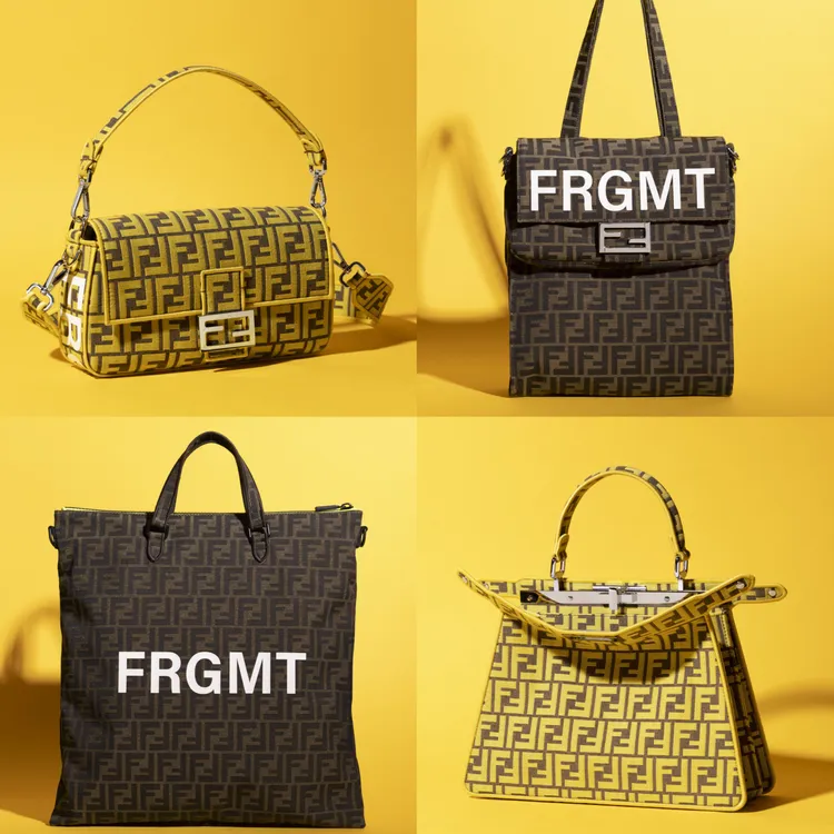 選擇在FF Fragment包款上濃縮了2品牌精髓,於FENDI最具代表的FF緹花圖樣上,將藤原浩所設計的FRGMT名稱以白色字樣搶眼點綴,除了沉穩的棕色、菸草色還有鮮豔搶眼的黃色。