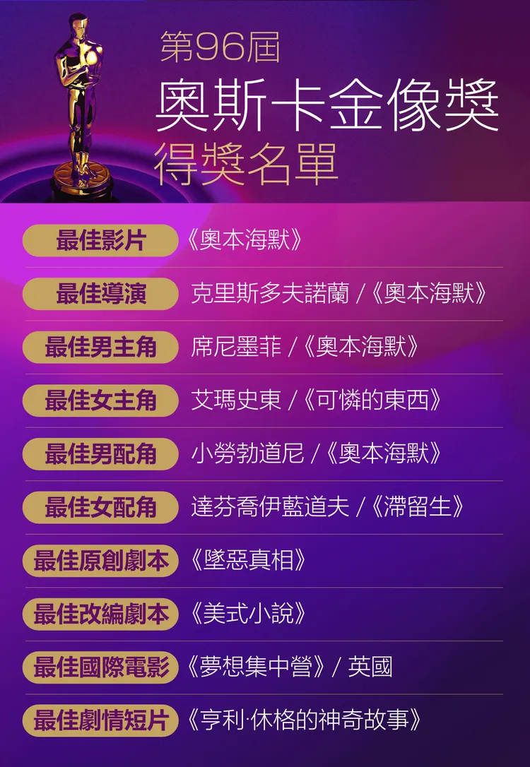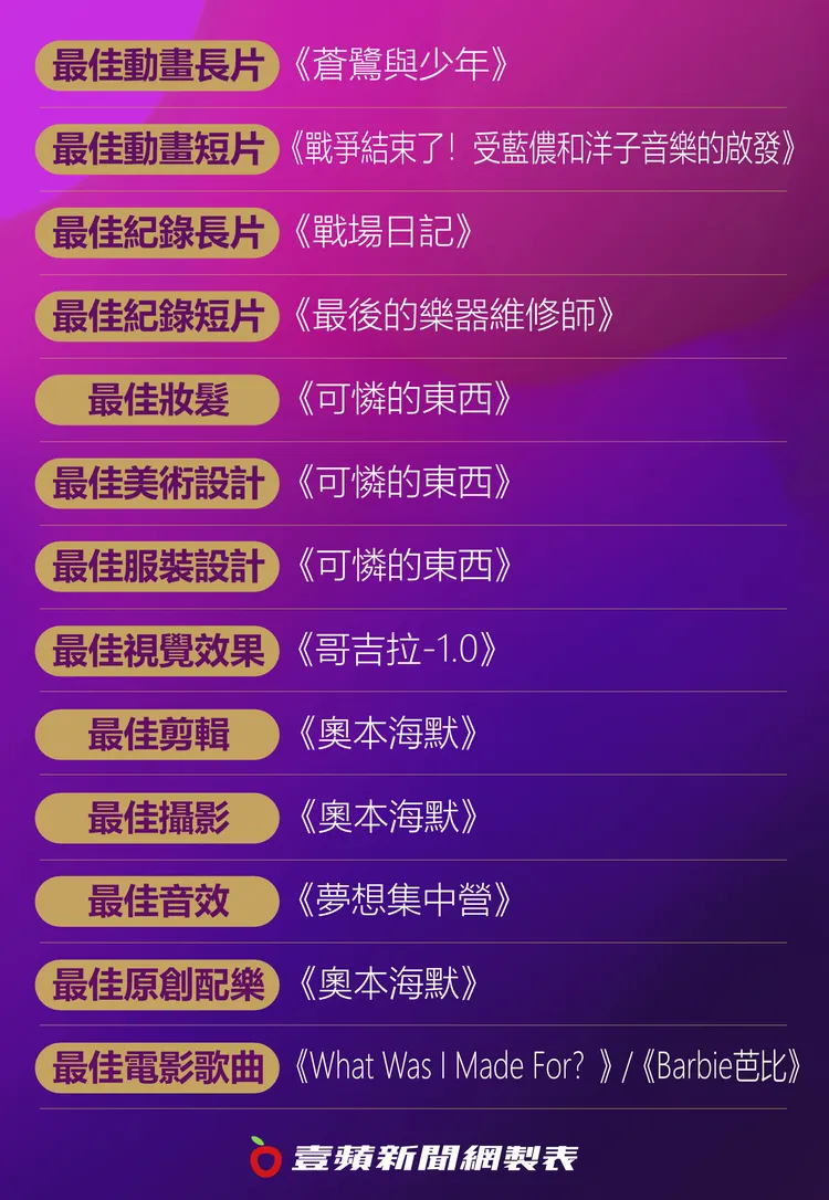 日本電影收穫頗豐,動畫大師宮﨑駿的《蒼鷺與少年》擊敗《蜘蛛人:穿越新宇宙》,這也是他繼2003年《神隱少女》後再度拿下奧斯卡最佳動畫,加上2014年個人獲得榮譽獎項「主席獎」,共擁3座小金人,不過他和製作人鈴木敏夫今天皆缺席。怪獸電影《哥吉拉-1.0》輾壓《不可能的任務:致命清算 第一章》、《星際異攻隊3》等好萊塢大片,奪下最佳視覺效果,締造日本影史新猷。