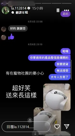 蕾菈在IG限時動態透露,在貓咪社團買了一台貓咪烘乾機,結果送來後竟然壞掉還爆開,她只好聯繫賣家,本來承諾會補寄或退款,對方卻直接消失,還把她封鎖,讓她直呼「原以為在臉書上買東西被騙這種事不會發生在我身上」。蕾菈也曬出瑕疵品的照片,提醒有在寵物社團的網友要小心。