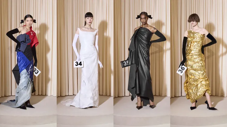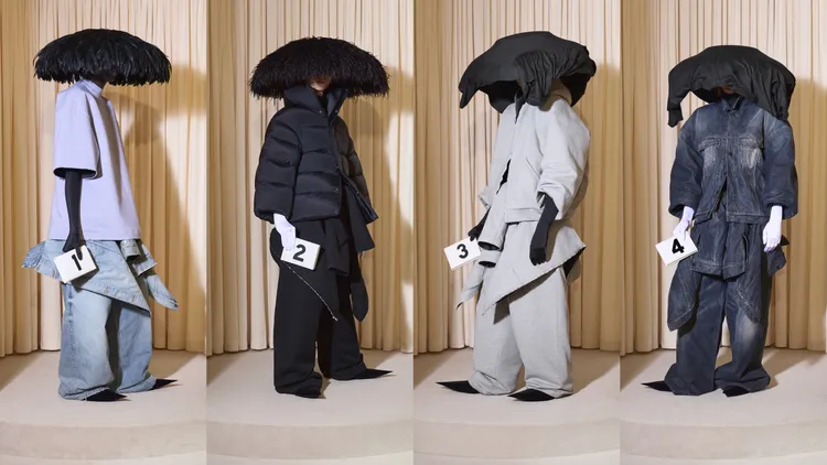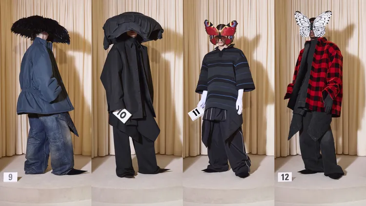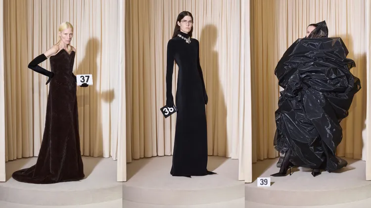 設計師Demna從品牌創始人Cristóbal Balenciaga的四個標誌性風格中汲取靈感,融入自己的設計作品中,包含強調服裝與身體空間感的繭型廓形、七分喇叭袖、奇異奢華頭飾和面料創新。