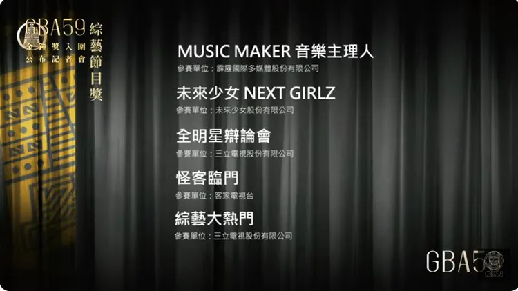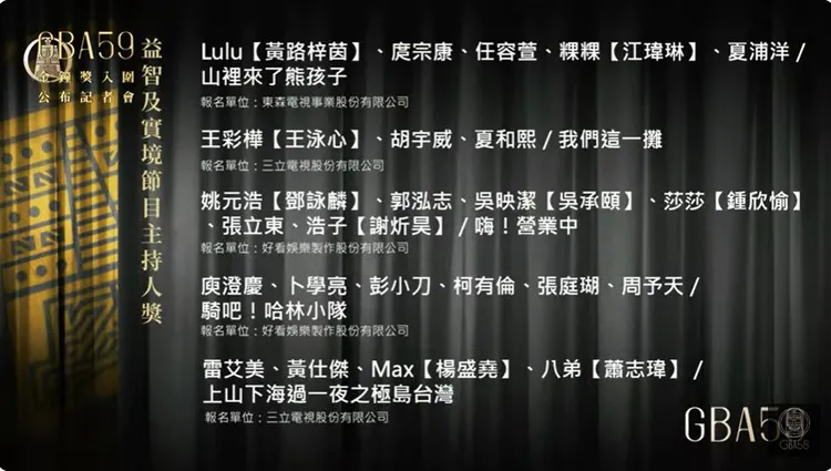 Lulu頗有斬獲,她另外入圍益智及實境節目主持人獎,和一同主持《山裡來了熊孩子》的庹宗康、任容萱、粿粿、夏浦洋,對上《我們這一攤》王彩樺、胡宇威、夏和熙、《嗨!營業中》姚元浩、郭泓志、吳映潔、莎莎、張立東、浩子、《騎吧!哈林小隊》庚澄慶、卜學亮、彭小刀、柯有倫、張庭瑚、周予天、《上山下海過一夜之極島台灣》雷艾美、黄仕傑、Max、八弟。