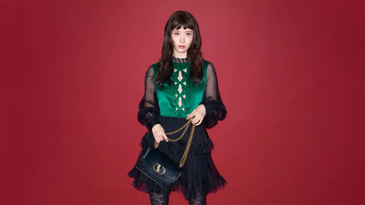 潤娥在今年9月時,就在Valentino的2025春夏大秀上亮相,換上Pavillon des Folies系列時裝,一身刺繡短裙搭配粉金色頭巾相當俏麗。此次晉升為代言人,潤娥在形象照中改穿著黑白格紋套裝搭配長襪、涼鞋,並以本季重點之一的Garavani Viva Superstar包款點綴造型;另也換上網紗拼接上衣配上蛋糕短裙,其中上衣中央的鏤空設計配上蝴蝶結元素,既性感又優雅。