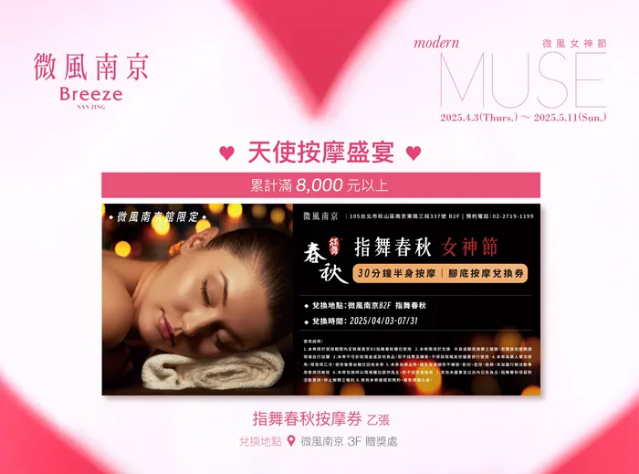 微奢華的按摩盛宴,天使般的按摩技法,是專業療癒的藝術表達,讓每一次觸碰,成為身心的極致享受。活動期間,憑微風會員資格當日累計消費滿 8,000元以上,即可兌換指舞春秋按摩券乙張。