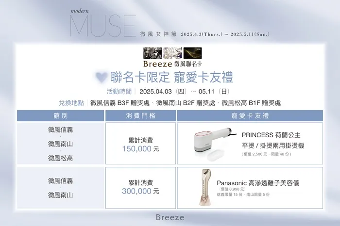 寵愛卡友,極致尊寵禮遇——活動期間,刷指定微風聯名卡,累積消費滿150,000元,即贈「PRINCESS 荷蘭公主平燙/掛燙兩用掛燙機」;滿300,000元,可獲得「Panasonic 高滲透離子美容儀」,以科技美學點綴您的優雅生活,讓時尚與美麗如影隨形!