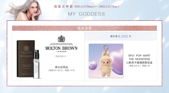 04.08 (二) - 05.11(日) ,使用IG「輪到你了」功能,分享「微風女神節限定打卡點」現場照片至限時動態,追蹤微風IG帳號並標記 @breezecenter,即可至微風信義 2F Molton Brown 專櫃兌換女神驚喜小禮一份!
