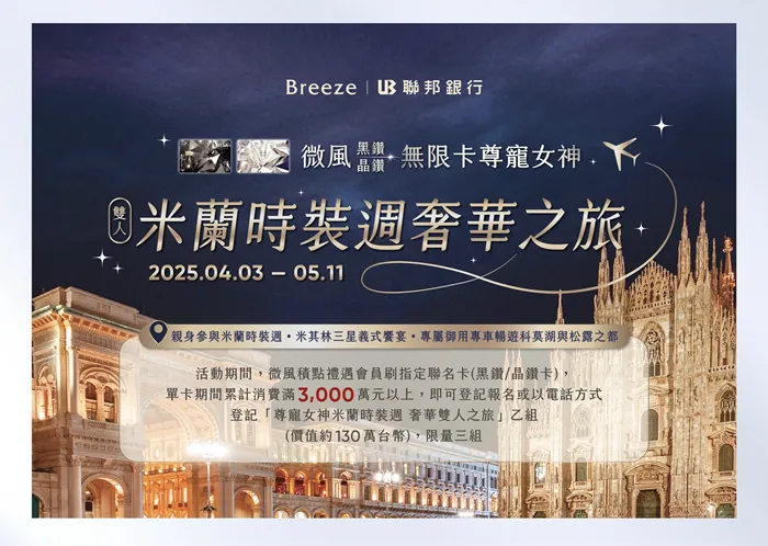 微風黑鑽/晶鑽無限卡尊寵女神 米蘭時裝週 雙人奢華之旅
