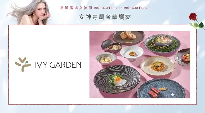 微風女神專屬奢華饗宴,讓「每一種食材,綻放獨特光芒」。採用最新鮮的食材,結合匠心獨具的烹飪技巧,為您在女神節打造一場以「女神」為主題的味蕾交響樂,邀您共享這場奢華的美食盛宴。活動期間,憑微風積點禮遇會員資格,當日於館內累計消費滿120,000元以上,珠寶、手錶專櫃消費滿240,000元,即可預約兌換Ivy Garden 「女神節限定雙人套餐」乙份。