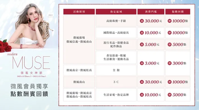 微風南山單筆消費滿8,000元,即贈「微風女神禮」乙份,以精緻美學點綴您的日常,讓優雅觸手可及。