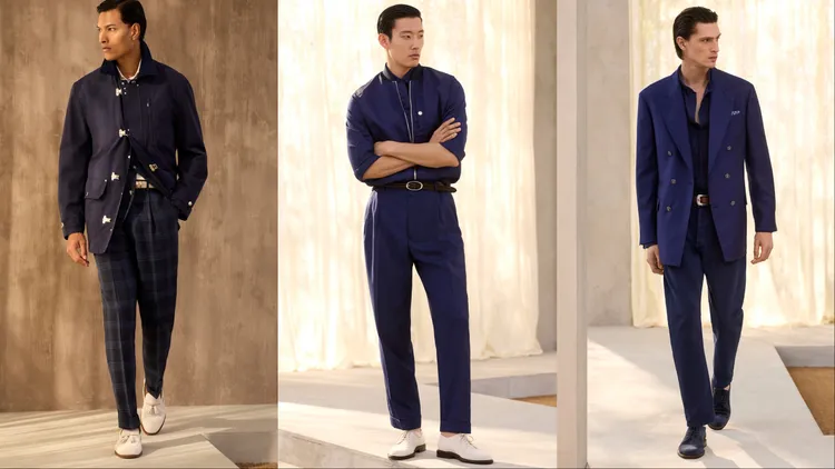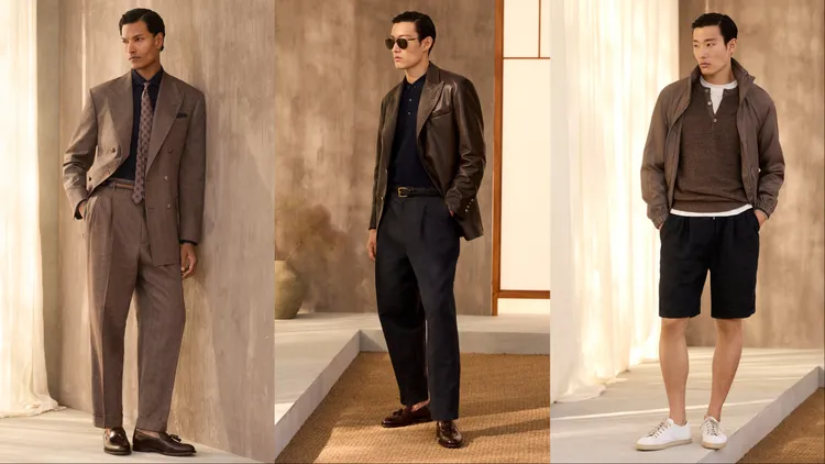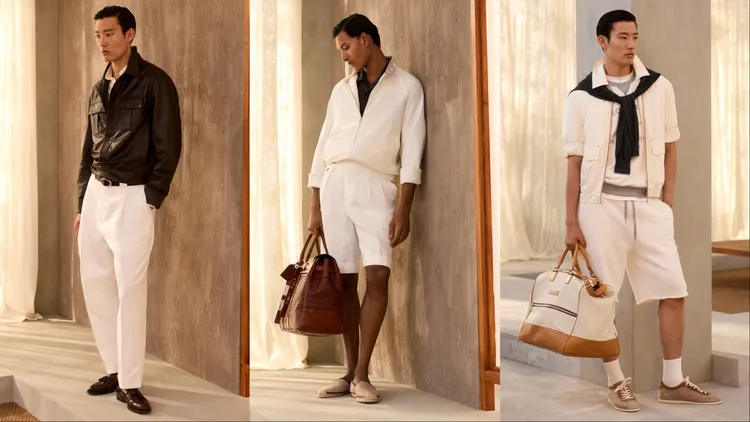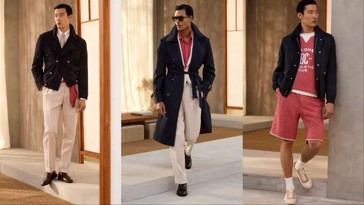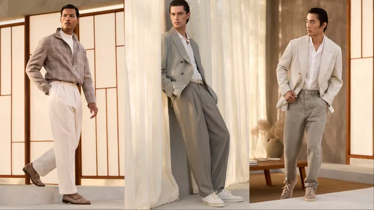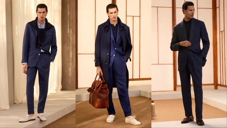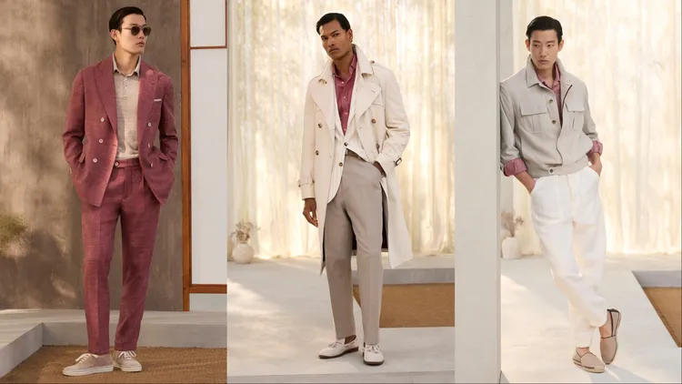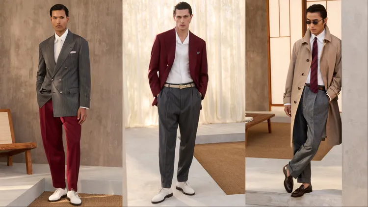 Brunello Cucinelli提到一種全新的男裝風格正應運而生,「在過去與當下、結構與流動、嚴謹與自然之間,遊刃有餘地保持高雅,卻從不顯得拘謹。」在全新一季中,品牌透過動態剪裁模糊了正裝與休閒裝的界限,如略顯修長的夾克和柔和線條的褲裝,令聯想起1990人年代紳士的優雅身影;晚裝系列則大膽採用非緞面青果領禮服,搭配休閒感的絲棉針織衫,在考究中注入新意。