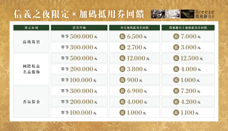 此次「杜拜流金之夜」主打高回饋點數方案,全館消費滿萬送千、滿千送百,點數最高10倍送回,加上微風聯名卡當晚加碼抵用券,消費回饋最高可達25%,堪稱本季最殺。活動期間憑微風積點禮遇會員資格,於指定櫃位單筆消費達指定門檻,即可享受酬賓點數立即回饋:高級珠寶單筆滿30,000元贈15000點($1,500元)、國際精品單筆滿10,000元贈10000點($1,000元)、名品服飾單筆滿5,000元贈5000點($500元)、香氛保養單筆滿3,000元贈3000點($300元),信義之夜當晚還有加碼抵用券回饋,使用微風聯名卡還能享特殊加碼優惠:高級珠寶單筆滿500,000元贈加碼抵用券6,500元、國際精品與名品服飾單筆滿500,000元贈加碼抵用券12,000元、香氛保養單筆滿300,000元贈加碼抵用券6,900元。除此之外,當晚累計消費達指定門檻還能兌換紙本酬賓券、NESPRESSO膠囊咖啡機、La Prairie鑽白魚子三件組與50分鐘的護膚療程,全館總回饋最高可達25%,讓您徜徉在流金之夜中,購物力百分百!