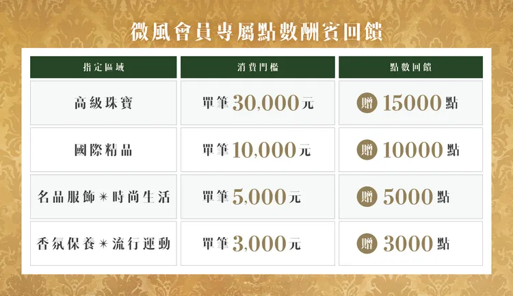 會員點數酬賓回饋活動內容:活動期間內憑微風積點禮遇會員,當日於指定櫃位單筆消費達指定門檻,並於結帳時宣告會員資格,即可享受酬賓點數自動歸戶服務,優惠隨身帶著走。